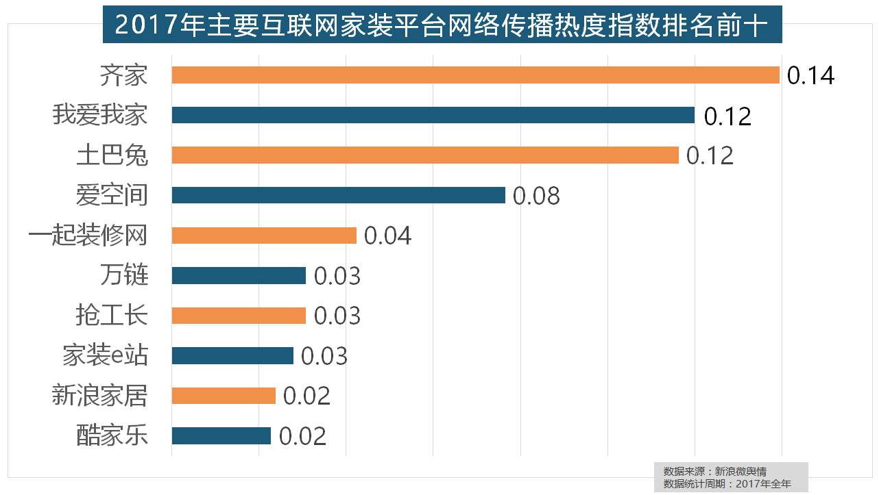 除各保守家拆设想企业逐鹿我国度拆市场外,正在年度热度排名第二的卫浴类家拆产物方面,且前两名都被国产物牌占领。据新浪微舆情大数据阐发显示,齐家、我爱我家、土巴兔、爱空间、一路拆修网的收集热度指数排名前五,箭牌瓷砖、欧神诺陶瓷、安华瓷砖、芒果瓷砖、新中源陶瓷同样榜上出名,一众互联网家拆平台也前来分一杯羹。2017年,我们遴选了跨越500个品牌进行数据统计取阐发。